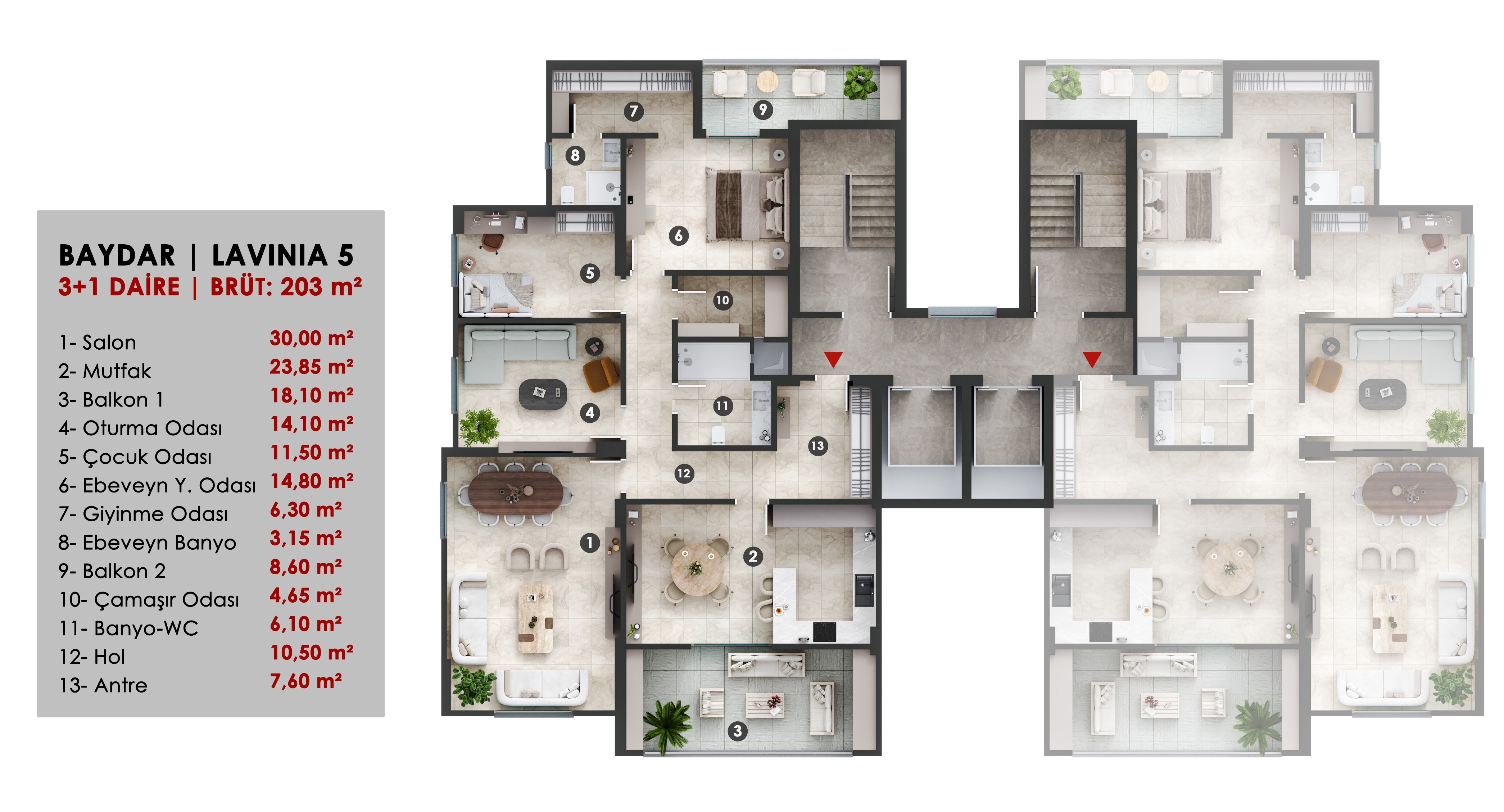 Baydar Lavinia 5, modern site yaşamını geniş metrekare avantajıyla buluşturan, seçkin ve planlı bir konut projesi olarak tasarlanmıştır.