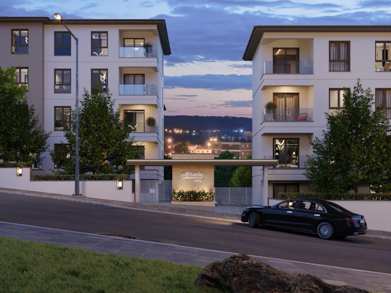 Akşam saatlerinde öne çıkan aydınlatma detayları, siteye prestijli ve güven veren bir kimlik kazandırırken; cam balkonlar ve net cephe çizgileri çağdaş bir yaşam anlayışını yansıtır. Mirada Avlu, “gösterişli olmadan seçkin” bir duruş sergiler.