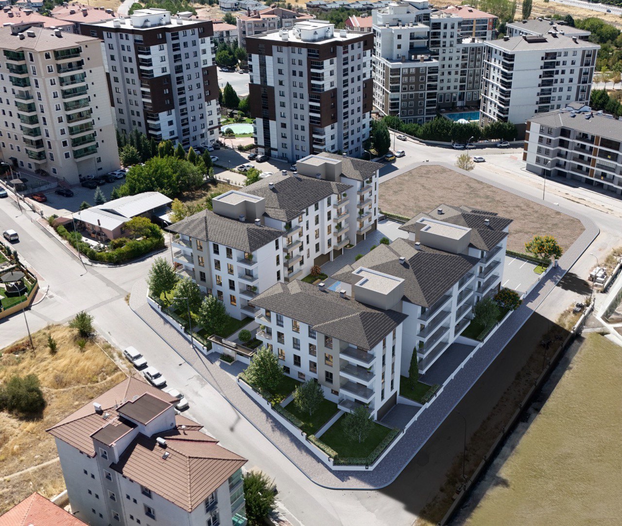 Havadan çekimlerde net biçimde görüldüğü üzere proje, çevresindeki yapılaşmadan ayrışan düşük katlı ve düzenli bir planlama anlayışına sahiptir.