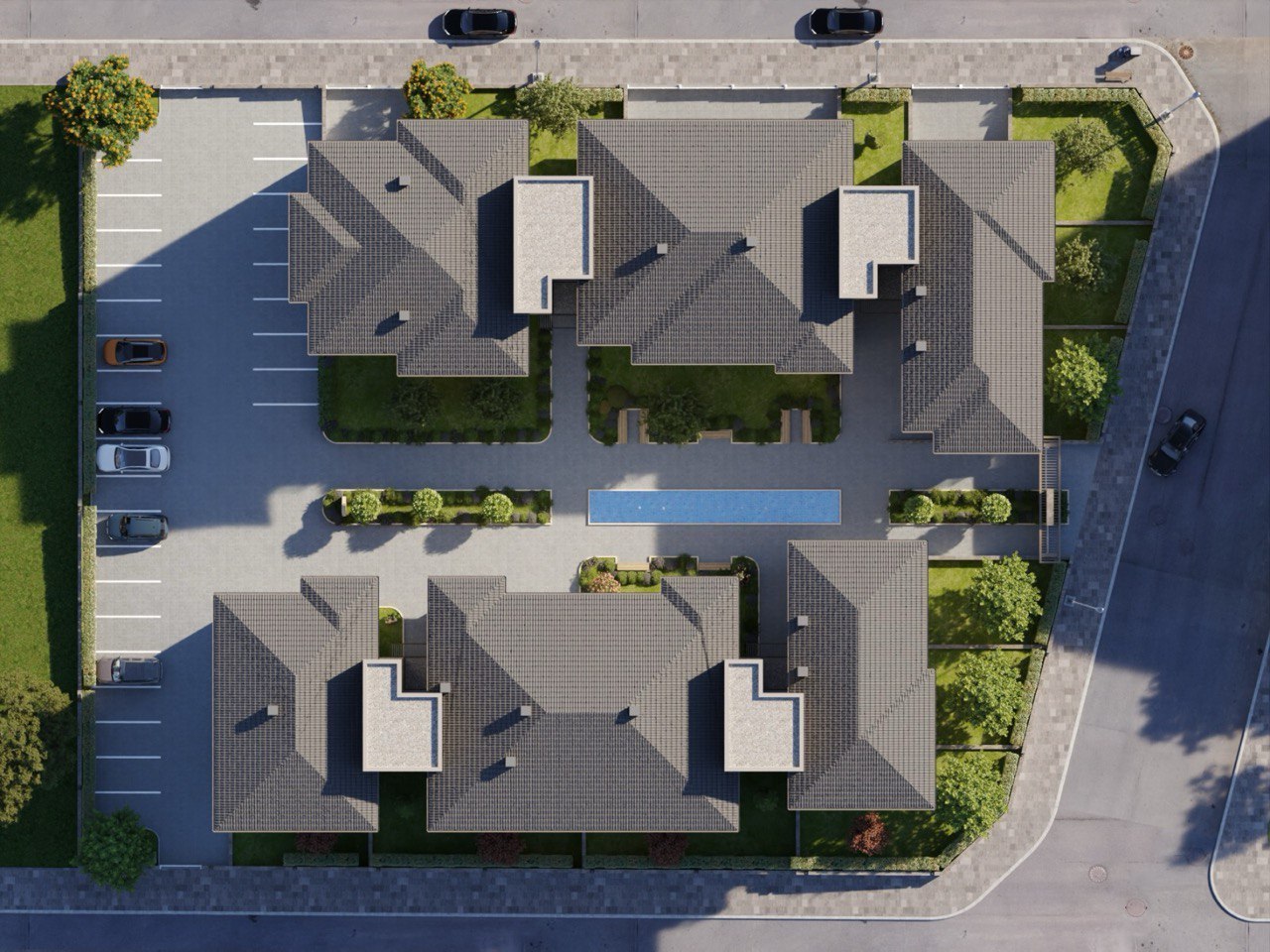 Site sınırları net biçimde belirlenmiş, açık alanlar ve yeşil dokuyla desteklenmiştir. Bu yaklaşım, hem sakin bir site yaşamı hem de uzun vadede değerini koruyan bir proje ortaya koyar.