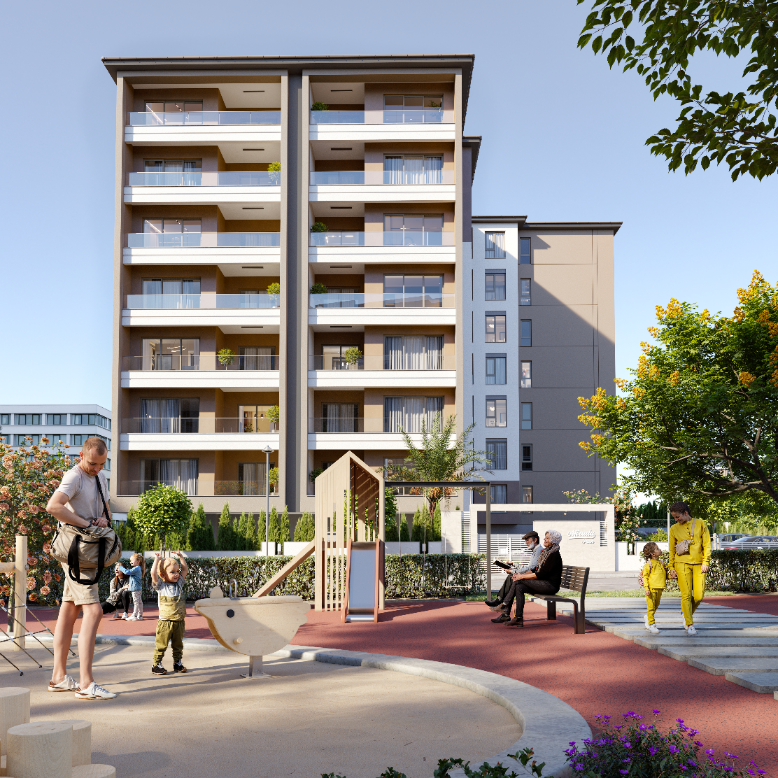 Görselde de görüldüğü üzere, yapı yerleşimi ferahlık hissini ön planda tutacak şekilde konumlandırılmış; açık cepheler, geniş balkonlar ve doğal ışık alan daireler ile yaşam alanları maksimum konfor sağlayacak biçimde tasarlanmıştır.